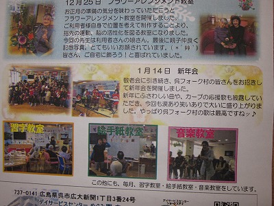 控え室に掲示されている「めぐみ園通信」に目を向けると,なんと呉フォーク村の記事を2か所も載せていた